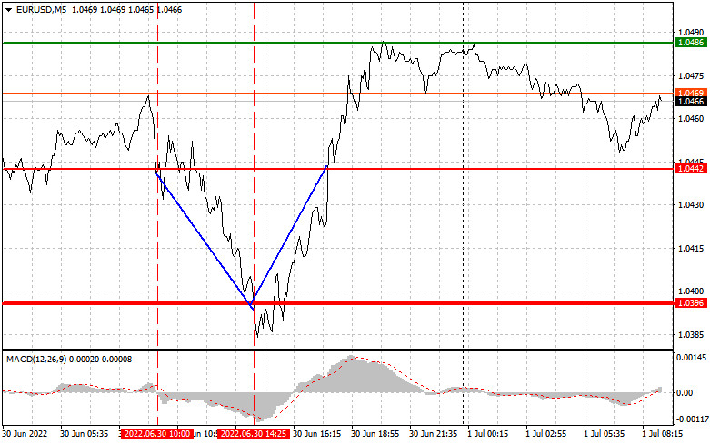 Pár EUR/USD dosáhl úrovně 1,0471, což vedlo k prodejnímu signálu na trhu, nicméně linie MACD byla daleko od nuly a omezila sestupný potenciál páru. O nějakou dobu později dvojice znovu testovala úroveň, ale tentokrát se objevil nákupní signál. To však také nevedlo k prudkým pohybům vzhůru. Úspěšný byl až třetí test, protože se mezitím linie MACD posunula pod nulu, což vedlo k poklesu páru o 25 pipů. Po zbytek dne se neobjevil žádný další signál.