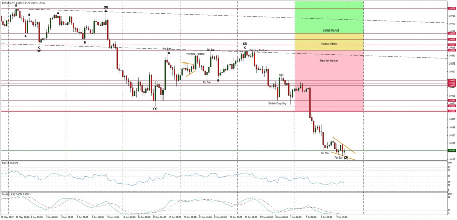 Pár EUR/USD vytrvale klesal, takže medvědi vytvořili nové měsíční minimum na hladině 1,0139 (v době psaní analýzy). V případě trvalého průrazu na nižší úrovně uvidíme další cíl medvědů na hladině měnové parity 1,0000. Poslední největší odraz byl zastaven v zóně nabídky, která se nachází mezi hladinami 1,0448 a 1,0469. Slabé a negativní momentum v časovém rámci 4H potvrzuje medvědí perspektivu eura, od té doby jsou všechny odrazy mírnější. Slabé a negativní momentum v časovém rámci 4H potvrzuje euru medvědí výhled. Všimněte si prosím, že navzdory úsilí z poslední doby účastníci trhu stále obchodují v zóně medvědů (růžová), stále se nemohou dostat na hladinu 1,0615, a aby vstoupili do zóny býků (zelená), potřebovali by prorazit nad hladinu 1,0678. Všechny mírné býčí odrazy jsou medvědy stále potlačovány.