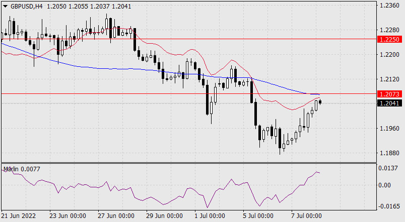 V grafu 4H se cena blíží k rezistenci cílové úrovně 1,2073, kterou posiluje linie indikátoru MACD (modrá). Jako hlavní scénář vývoje událostí očekáváme obrat dolů.