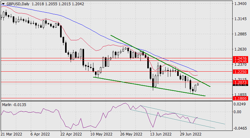 V denním grafu se cena blíží k silné rezistenci cílové úrovně 1,2073 a horní linii klesajícího klínu. Signální linie oscilátoru Marlin stoupá nad horní hranici vlastního kanálu a ruší ho tak. Dále čekáme na obrat ceny ze silné zóny rezistence a snahu opustit klín ve směru dolů.
