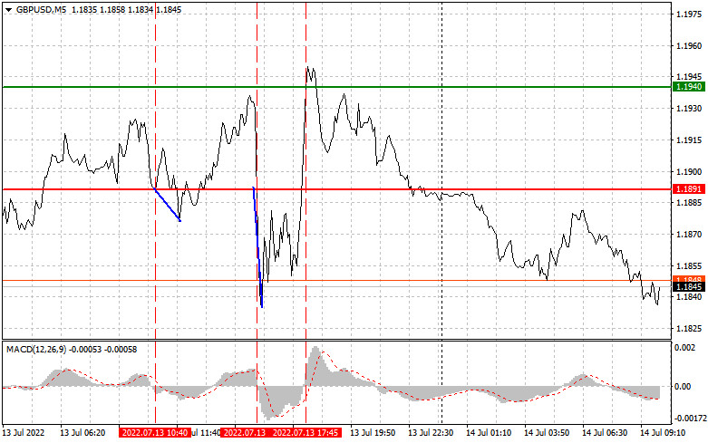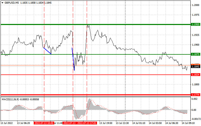 Prodejte libru, když kotace dosáhne úrovně 1,1824 (červená linie na grafu) a vyberte zisk na ceně 1,1774. Tlak se vrátí, pokud nejnovější data v USA naznačí rostoucí inflační tlak. Při prodeji se však ujistěte, že je linie MACD pod nulou nebo se od nuly začíná pohybovat dolů. Libru lze také prodávat za 1,1875, ale linie MACD by měla být v překoupené oblasti, protože jedině tak se trh obrátí k úrovním 1,1824 a 1,1774.