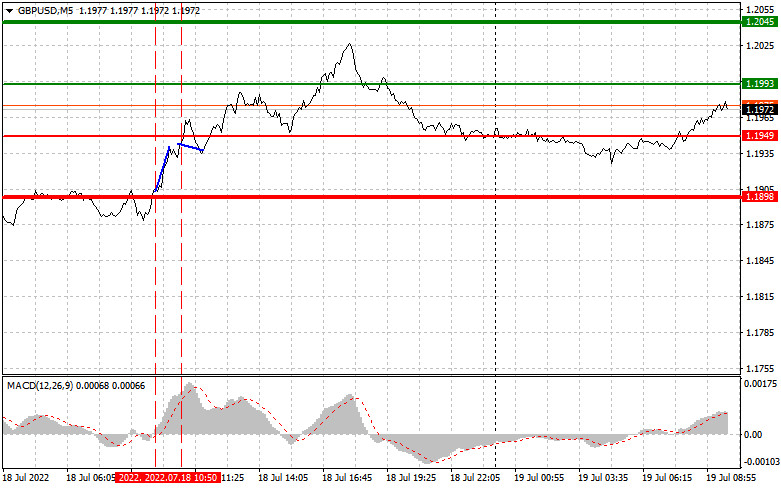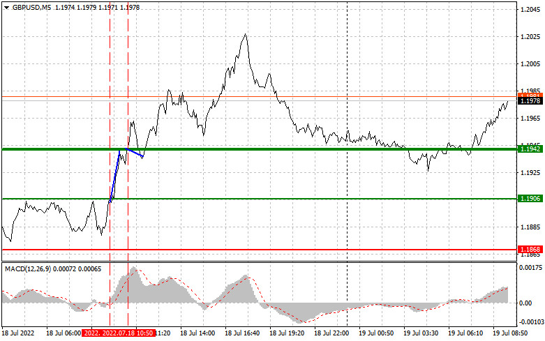 Pár GBP/USD testoval v pondělí úroveň 1,1906. V té době se linie MACD právě začínala pohybovat nad nulou, takže nákup byl vhodný. Dlouhé pozice vedly k nárůstu ceny o přibližně 30 pipů. Prodejci mezitím očekávali, že se euro přiblíží k úrovni 1,1942, ale než toho dosáhlo, libra přestala posilovat a došlo ke korekci směrem dolů. Po zbytek dne se neobjevily žádné další signály.