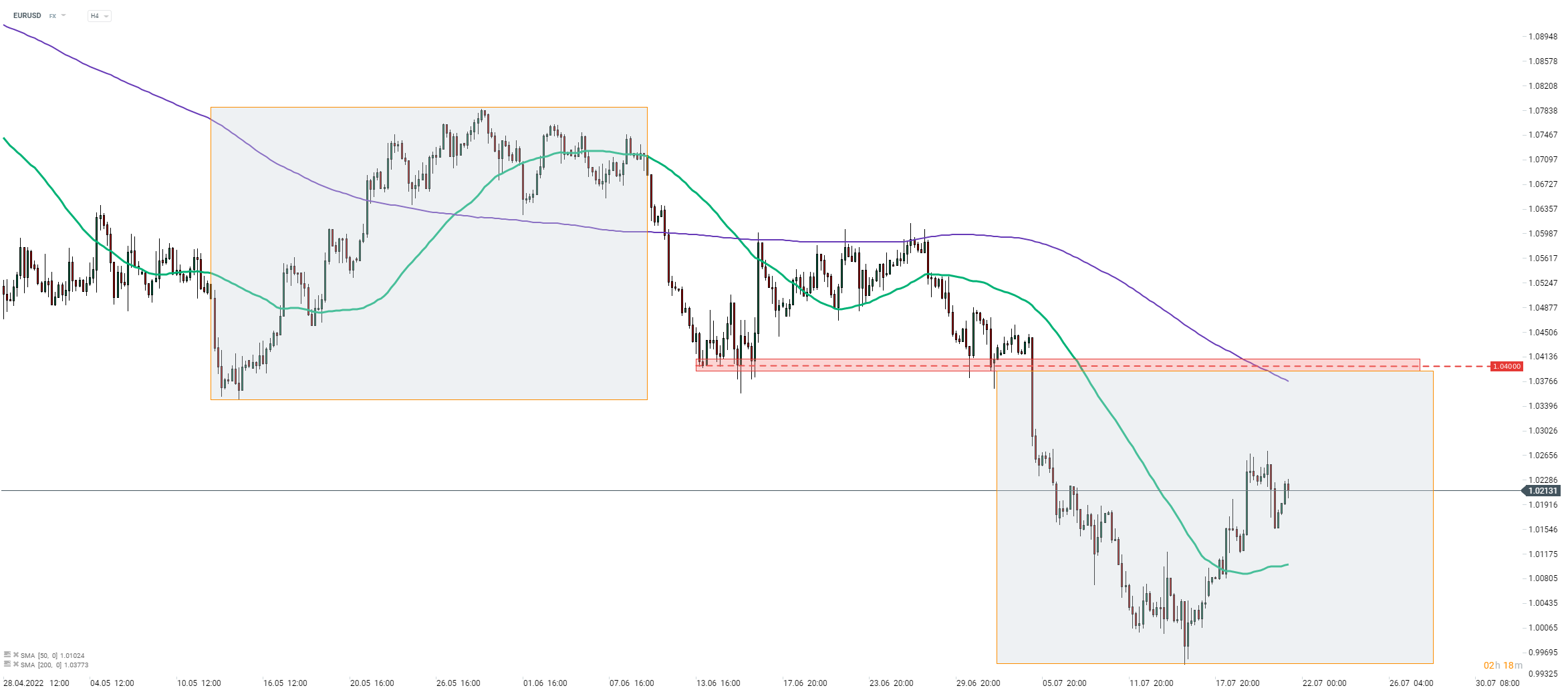Když se podíváme na graf EURUSD v intervalu H4, můžeme vidět, že po včerejším krátkém poklesu pár dnes pokračoval ve vzestupném pohybu. Po obnovení toků plynu přes Nord Stream 1 došlo k růstu EUR. Rozhodnutí ECB o sazbě je však pro EUR velkou volatilní událostí a může vést k úplnému obratu v sentimentu. Pokud však ECB zvýší sazbu o 50 bazických bodů a doprovodí jestřábí tón, může EURUSD růst nad včerejší maxima a směrem k nejbližší zóně klíčové rezistence v oblasti 1,0400, označené horní hranicí struktury Overbalance.