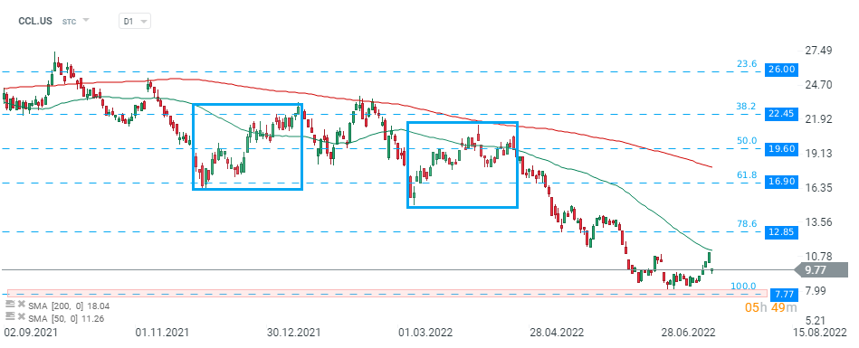 Akcie Carnival (CCL.US) zahájily dnešní seanci v medvědím trendu. Pokud by aktuální sentiment přetrval, cena může klesnout až k minimům na 7,77 USD. V případě změny sentimentu se nejbližší rezistencí 12,85 USD, což odpovídá 78,6% Fibonacciho retracementu vzestupné vlny zahájené v březnu 2020. Zdroj: xStation5