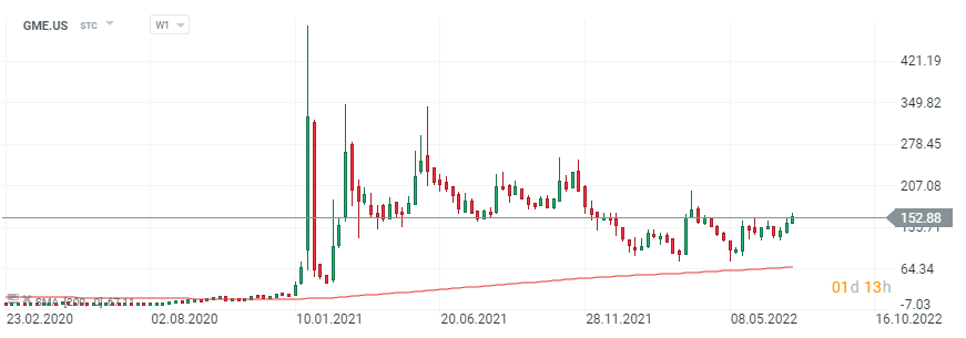 Gamestop (GME.US), W1 interval. Akcie pokračují v pohybu do strany. Zatím jim příliš neublížila ani nervozita na trzích spojená s růstem úrokových sazeb. Cena se nachází nad úrovní 200 týdenního klouzavého průměru. Zdroj: xStation5