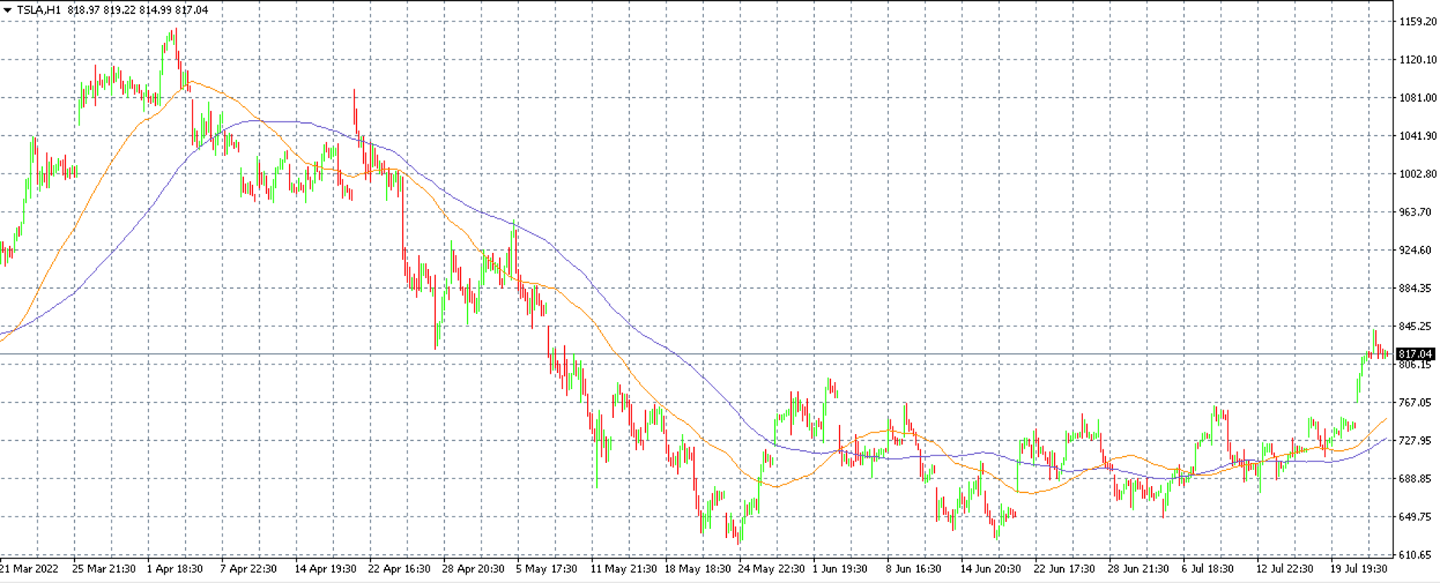 Graf č. 1: Akcie společnosti Tesla v platformě MT4 na časovém rámci H1 společně s 50 a 100 denním klouzavým průměrem