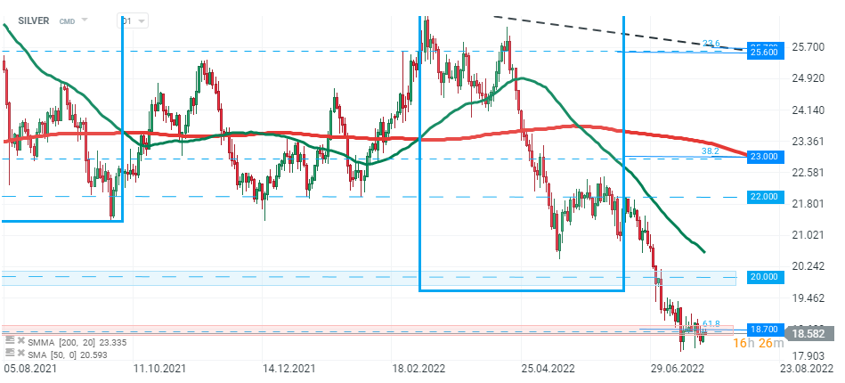 Stříbro zůstává v konsolidaci kolem hlavního supportu na 18,70 USD. Zdroj: xStation5