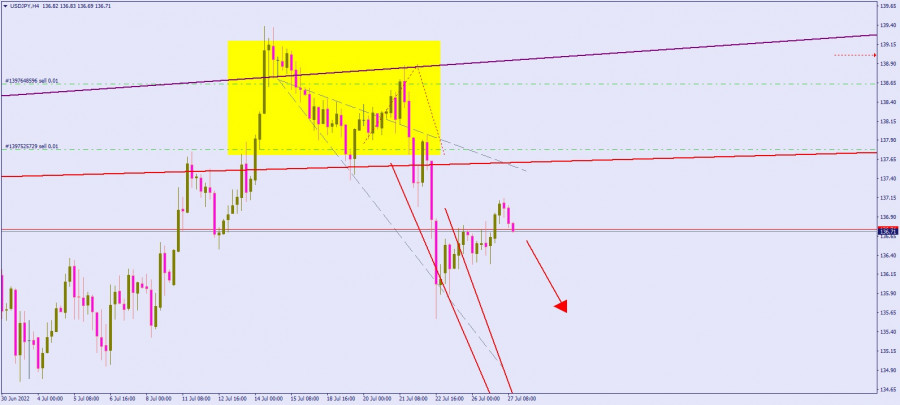 Graf znázorňuje pohyb páru USD/JPY ve čtyřhodinovém grafu (4H). Porovnáme-li nedávný pohyb s pohybem z 19. a 27. června, zřetelně vidíme nejistotu trhu, která páru brání dokončit korekci. Přesto je šance, že se kotace dostanou na úroveň 135,50 a pak klesnou na úroveň 129,00. To je vcelku mírná korekce. -