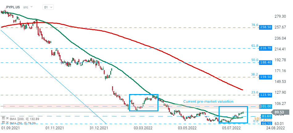 Finanční výsledky společnosti PayPal (PYPL.US) investory zklamaly. Přestože společnost zvýšila svůj celoroční odhad zisku, mírně snížila odhad růstu marží. Investoři jejím prostřednictvím zhodnotili stále náročnější prostředí pro provozní marže a o 2 miliardy USD nižší objem zpracovaných plateb v mezičtvrtletním srovnání. V důsledku toho se akcie včera propadly na úrovně, které nebyly k vidění od podzimu 2017. Jako důvod nižších objemů management uvedl makro faktory - obecnou slabost spotřebitelů a inflaci. Vedení platební společnosti již dříve varovalo, že inflace poškozuje podnikání. -