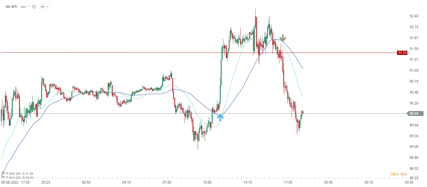 Cena se propadla, i když teoreticky lze očekávat dosažení úrovně 90,5, kde se cena konsolidovala v průběhu minulé asijské seance. Zdroj: xStation5