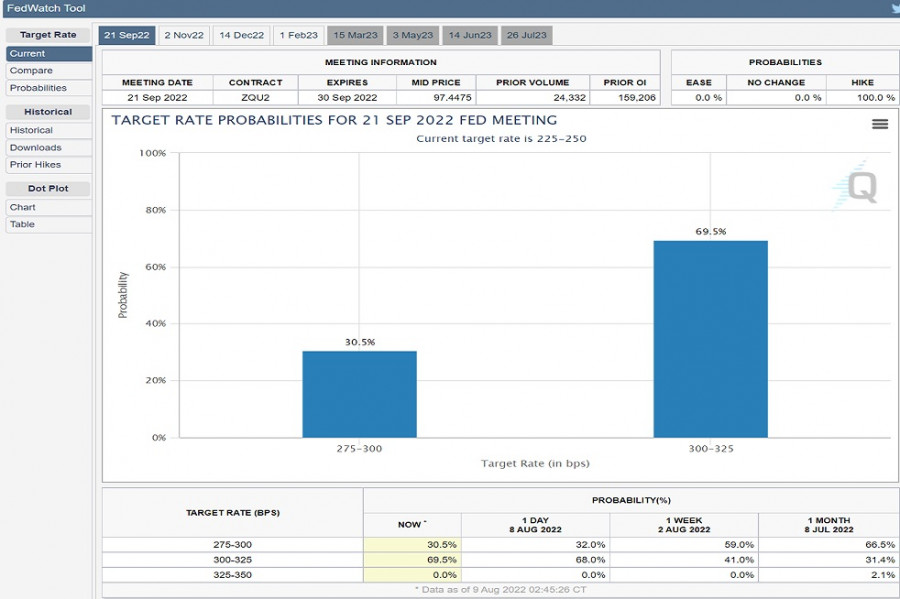 Pravděpodobnost, že Fed v září potřetí po sobě zvýší sazbu o 75 bazických bodů, se za poslední měsíc zdvojnásobila. 8. 7. 2022 předpověděl nástroj CME FedWatch 31,4% šanci na zvýšení sazeb v září o %. Zrovna minulý týden, 2. 8., nástroj FedWatch předpověděl 41% šanci.