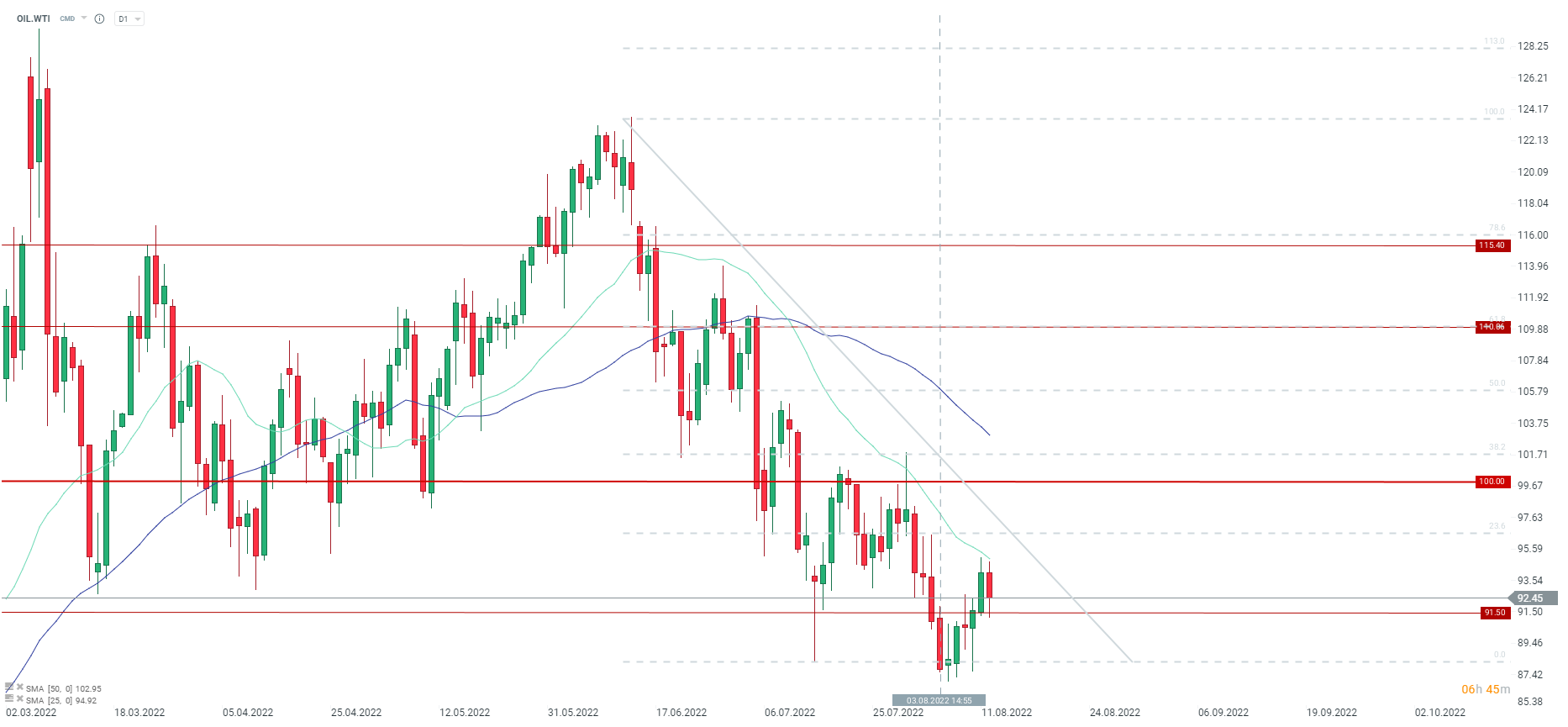 Cena se opět otáčí z 25 SMA a pokračuje klesajícím trendem na nižší minima a nižší maxima. Nicméně poptávka nevypadá tak špatně, jak se v nedávných týdnech odhadovalo. Existuje tedy šance, že příští týden přinese býkům určitou úlevu. Na druhou stranu lze očekávat, že obchodníci budou následovat trend akciového trhu, další vývoj tak bude záviset jednak na fundamentu ropy, ale i na sentimentu trhu. Zdroj: xStation5