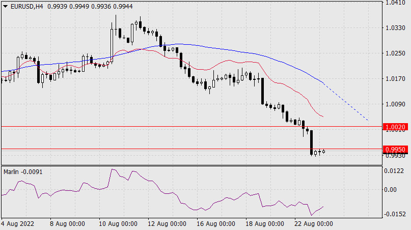 Na čtyřhodinovém grafu se cena usadila pod cílovou úrovní 0,9950. Zřejmě bude cena pod touto úrovní chvíli odpočívat, konsolidovat se a pak bude pokračovat v poklesu.