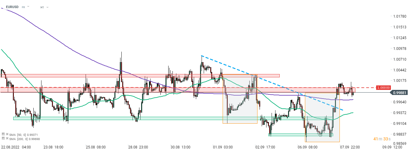 Pri pohľade na graf EURUSD v intervale H1 vidíme, že pár sa pokúsil posunúť nad zónu odporu 1,00, ale nepodarilo sa mu to. Pár sa prelomil nad klesajúcu trendovú čiaru a hornú hranicu lokálnej geometrie trhu, ale neskôr sa mu nepodarilo zachytiť ponuku, pretože sa zdá, že trh je v režime čakania na rozhodnutie ECB. Ak dôjde k poklesu, krátkodobú podporu možno nájsť na 200-hodinovom kĺzavom priemere (fialová čiara).