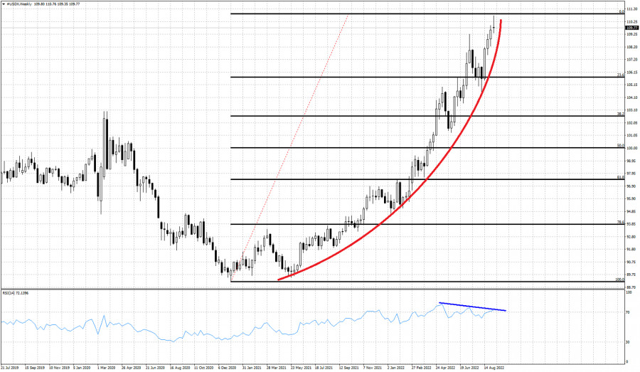 Dolarový index vytváří každý týden nová vyšší maxima. Býci mají trend dál plně pod kontrolou a z technického hlediska nic nenasvědčuje obratu. Podle RSI existují známky slábnutí býčího momenta a vytváření parabolického tvaru svíčkového vzorce. Přišel čas short pozic nebo otvírání nových short pozic? Nejsme jasnovidci. Býci by ale měli být obezřetní. Před více než rokem, konkrétně v březnu a dubnu 2021, kdy se dolarový index obchodoval kolem úrovně 90, jsme medvědy varovali, že se s velkou pravděpodobností zopakuje rok 2017 a obrat nahoru, který následoval po minumu na úrovni 90, k další rally minimálně k úrovni 103. Nastal čas, abychom varovali dolarové býky. Nesnažíme se přivolávat vrchol. Býci by měli chránit své zisky a snažit se vytvořit si strategii pro nadcházející obrat. Týdenní svíčka už vykazuje známky vrcholu, ačkoli je zatím brzy. Scénář, podle kterého vrchol už přišel, očekává přinejmenším pullback k úrovním 103–102. Takový pullback by neměl zůstat bez povšimnutí. Očekávám, že vzestupný trend dolarového indexu bude v nadcházejících týdnech vykazovat známky obratu. Z technického hlediska je takový pullback opodstatněný. Parabolické vzestupy mají tendenci k prudkým korekcím. Obchodníci tudíž musí být ve střehu.