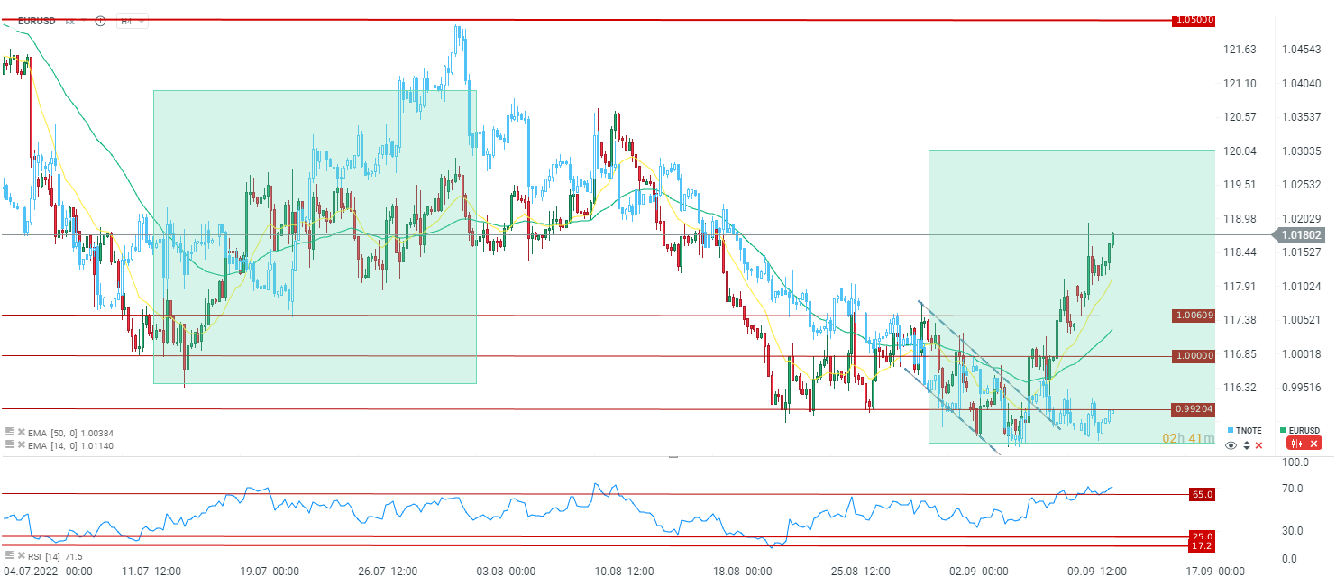 Velmi jestřábí rétorika ze strany ECB a kapitulace dolaru vedly k výrazným pohybům na euru. EUR/USD testuje 1,01 – nejvyšší úroveň od 18. srpna. Průměr za 50 dnů se při pohledu na interval H4 nachází poblíž této úrovně. Od ledna toto MA působí jako silná rezsitence. Pokud by došlo k prolomení výše, může se pohyb nahoru zrychlit směrem k horní hranici struktury 1:1 a byl by největším býčím impulsem od začátku roku. -