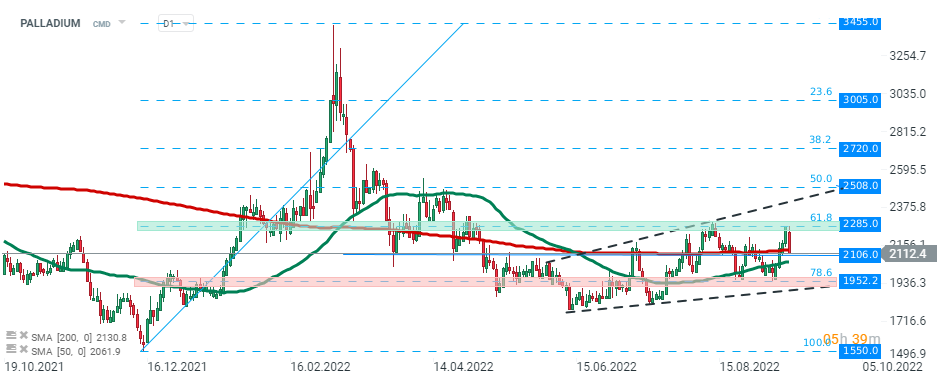 Palladium se obchoduje kolem 38 % pod březnovými maximy. Cena dnes prudce klesla, když se kupujícím opět nepodařilo prolomit hlavní odpor na 2285 USD za unci, což se shoduje s 61,8% Fibonacciho retracementem poslední vzestupné vlny. Pokud se prodejcům podaří udržet současnou dynamiku, podpora na 1952 USD může být ohrožena. Zdroj: xStation5