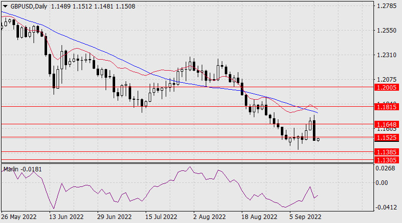 Podle včerejšího zasedání Bank of England, která zvýšila sazbu o 0,50 %, se libra obchodovala v širokém rozpětí a uzavřela den se ztrátou 8 bodů. Vzhledem k tomu, že je horní stín delší než spodní, můžeme předpokládat, že býci dokázali potlačit tlak medvědů, který trvá od 13. září. Cena také na denním grafu konverguje s oscilátorem Marlin.