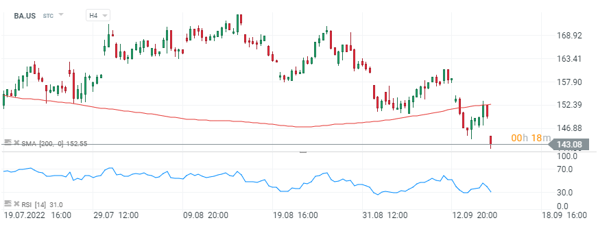 Boeing (BA.US), interval H4. Akcie vstoupily do silného sestupného trendu, který byl zahájen poklesem pod průměr 200 relací (SMA200), který se pohybuje na úrovni 152 USD. RSI pomalu vstupuje do přeprodané zóny, i když strašná atmosféra na Wall Street může táhnout cenu ještě níže. Zdroj: xStation5