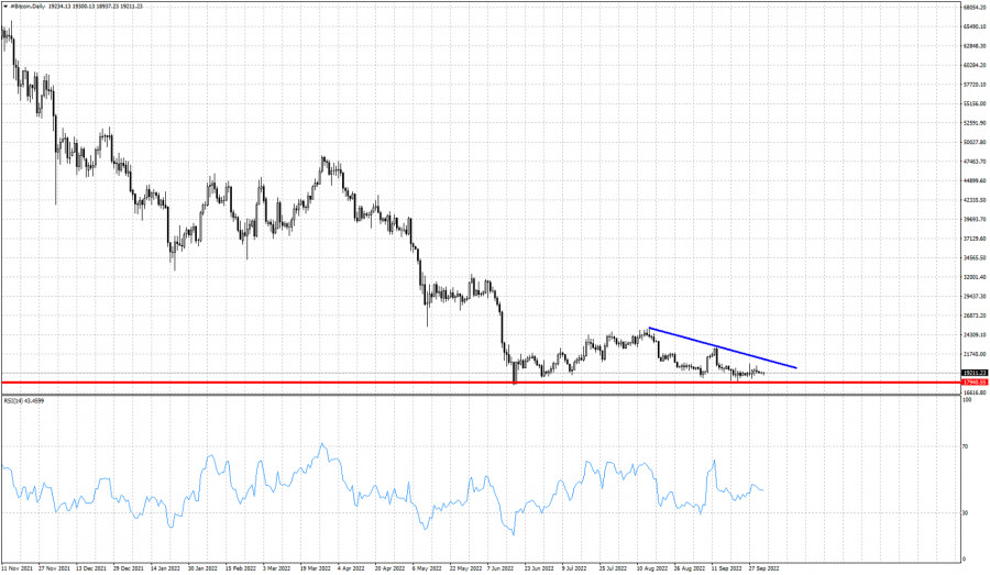 Uplynul další týden, kdy se bitcoin drží mezi úrovněmi 18 000 a 21 000 USD. Cena se nadále pohybuje do stran bez jasného směru. Tato neutrální boční situace převládá od začátku června. Býci se pokusili stlačit cenu nad hladinu 25 000 USD, ale nepodařilo se jim to a cena se vrátila na svá letošní minima. Obchodníci by měli být trpěliví a počkat na prolomení klíčové úrovně. Vzhledem k tomu, že střednědobý trend zůstává medvědí, je medvědí i náš hlavní scénář a jako nejpravděpodobnější scénář vidíme pokles na nová minima roku 2022. Prolomení nad modrou klesající trendovou linií rezistence oddálí tento pokles na nová minima, protože pomůže ceně odrazit se výše nad hladinu 25 200 USD a možná až na úroveň 30 000 USD.