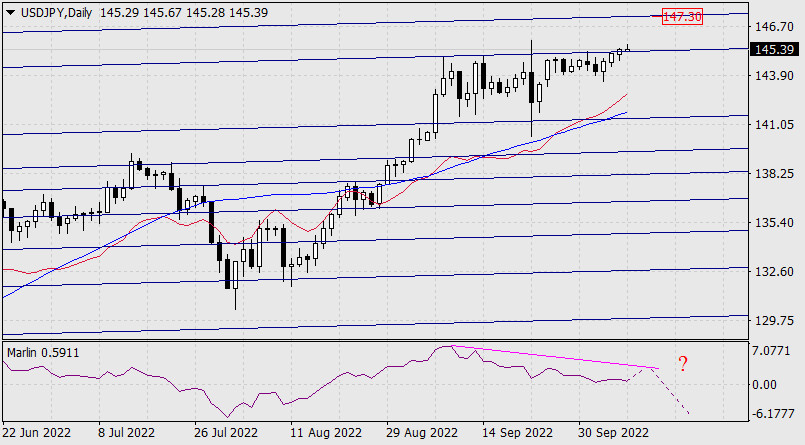 V současné době se linie oscilátoru Marlin pohybuje do strany v kladné oblasti, těsně nad nulovou linií. Pokud se cena potká s oscilátorem na úrovni 147,30, může se vytvořit divergence, která se stane signálem a podmínkou pro obrat trendu do hluboké korekce (nebo obrácení střednědobého trendu).