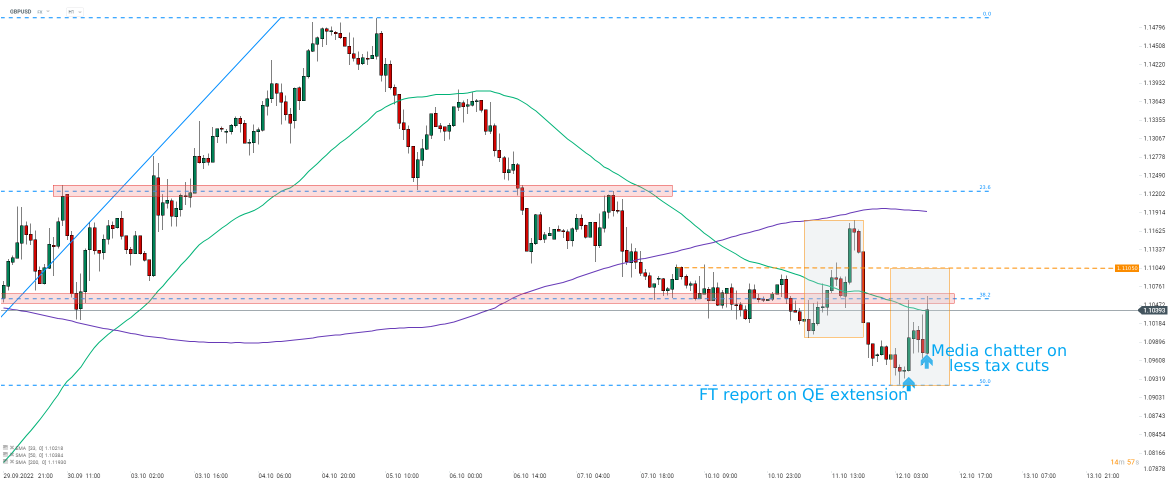 Nepokoje na britskom dlhopisovom trhu pretrvávajú a existuje riziko panického predaja britských dlhopisov, ak BoE stiahne svoju podporu. Predĺženie do konca októbra by sa zdalo rozumné, keďže vláda predložila oznámenie o strednodobom rozpočte, ktorého predloženie je teraz naplánované na koniec tohto mesiaca. Pripomeňme, že to bolo oznámenie nového fiškálneho plánu, vrátane masívneho zníženia daní bez financovania, čo spustilo výpredaj na britskom dlhopisovom trhu. Strednodobý rozpočet načrtne zdroj financovania a môže zmierniť obavy účastníkov trhu. Keď už hovoríme o fiškálnych plánoch, GBP dostala dnes ráno ďalšiu podporu v médiách, ktoré hovorili o tom, že premiér Truss sa môže rozhodnúť zrušiť ešte viac ohlásených nápadov na zníženie daní.