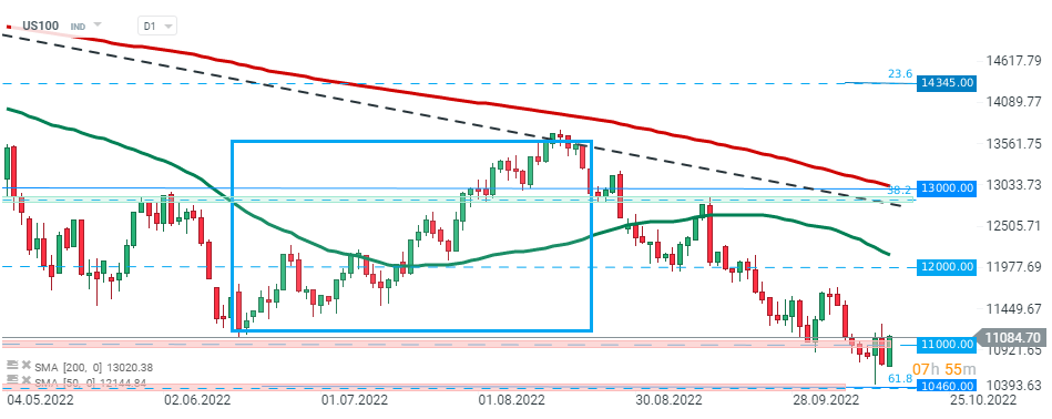 Nálada na trhu se na začátku nového týdne výrazně zlepšila, částečně díky lepším než očekávaným čtvrtletním výsledkům Bank of America. Přesto se druhá největší americká banka připojila k dalším velkým bankám, včetně JPMorgan, v meziročním poklesu zisku za třetí čtvrtletí, a to uprostřed zpomalující aktivity investičního bankovnictví a nárůstu rezerv v očekávání zhoršující se ekonomiky. Velké technologické společnosti, včetně Tesla, Netflix a Snap, poskytnou své čtvrtletní výsledky koncem tohoto týdne. Investoři také uvítali, že vláda Spojeného království obrátila svůj fiskální plán na opačnou stranu. Nově jmenovaný ministr financí Hunt dnes oznámil, že zruší téměř všechna dříve oznámená daňová opatření, která navíc podpořila rizikové nálady. V důsledku toho index US100 vzrostl o 3 % a prolomil nad hlavní rezistencí na 11 000 bodech, což je označeno předchozími cenovými reakcemi a spodní hranicí struktury 1:1.