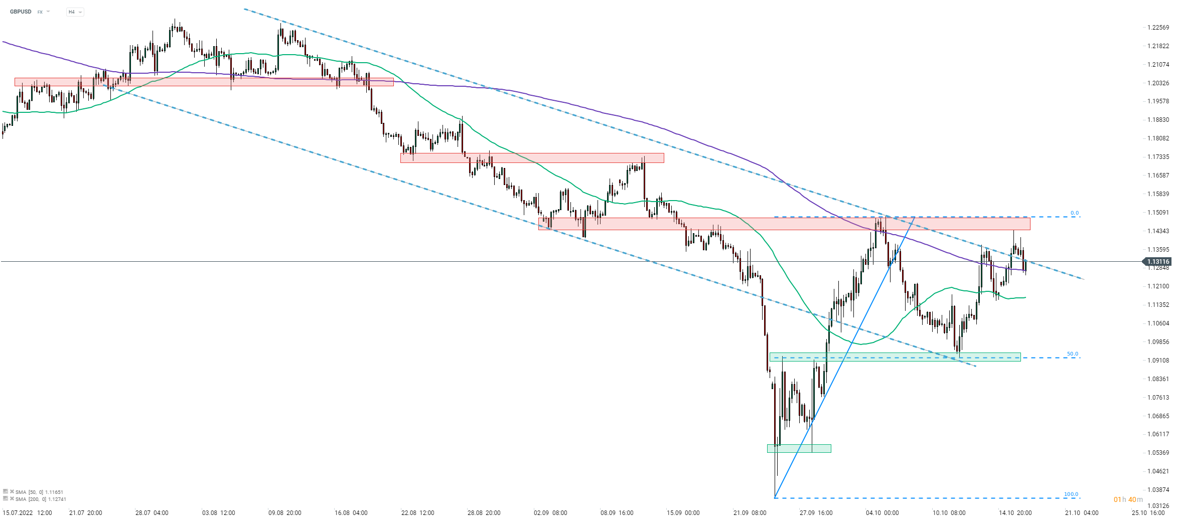 GBP trochu ztratila dech, protože sázky BoE na zvýšení sazeb začaly po posledním vývoji klesat. Trh však stále vidí hike o 100 bazických bodů během zasedání 3. listopadu 2022. Všimněte si, že toto rozhodnutí o sazbě přijde po – předložení střednědobého rozpočtu a spuštění QT – takže bude velmi bedlivě sledováno. Pohled na graf GBPUSD v intervalu H4 ukazuje, že pár se tento týden pokusil posunout nad horní hranici sestupného kanálu, ale zatím se mu nepodařilo dosáhnout výraznějšího průrazu. Růst zpět nad klouzavý průměr za 200 období (fialová čára), který nyní funguje jako podpora, je pozitivní, ale bude stačit k tomu, aby pár navždy opustil sestupný kanál? Pokud tomu tak je, pozornost trhu se přesune do zóny rezistece 1,1500, která zastavila růst na začátku října.