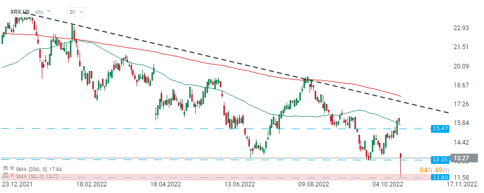 Akcie Xeroxu (XRX.US) testovaly 13letá minima kolem 11,80 USD, nicméně kupujícím se později během seance podařilo vymazat některé ztráty a cena se vrátila nad nedávná minima na 13,20 USD. Nicméně hlavní sentiment zůstává medvědí a pouze rozhodující proražení nad sestupnou trendovou linii by předznamenalo potenciální obrat trendu. Zdroj: xStation5