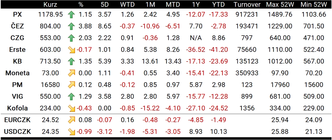 Nejvýkonnějším titulem pražské burzy se dnes stal ČEZ (CEZ1.CZ) poté, co Piráti stáhli svůj návrh na uplatnění Windfall tax již v letošním roce. Akcie největší tuzemské energetické společnosti podpořilo i posunutí návrhu na zdanění mimořádných zisků, 60% sazbou, do třetího čtení. To se v Poslanecké sněmovně bude konat 4. listopadu. Banky na nové zprávy reagovaly méně euforicky, když Komerční banka (KOMB.CZ) získala 1,35 % a uzavřela na 713,50 Kč a Moneta (MONET.CZ) se obchodovala do strany. ERSTE (RBAG.CZ) dokonce vykázala ztrátu ve výši 0,17 % a stala se nejméně výkonnou složkou pražského indexu.