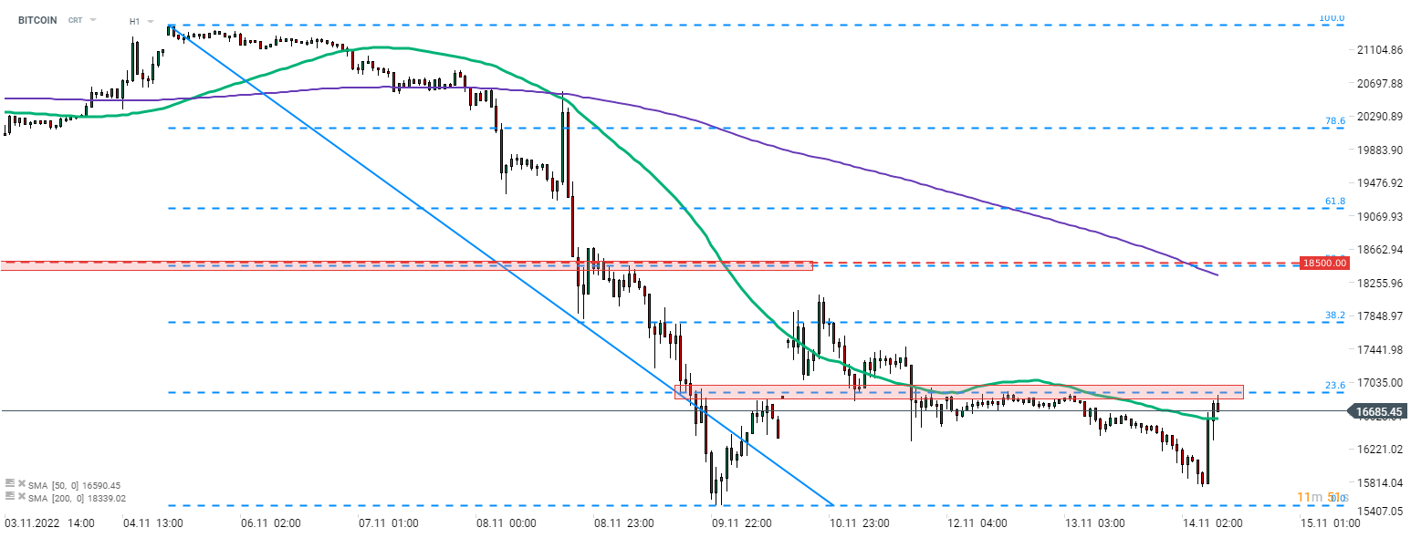 Keď sa pozrieme na graf bitcoinu v intervale H1, môžeme vidieť, že kryptomena dnes ráno zaznamenala silný pohyb nahor. BITCOIN vyskočil z približne 15 800 USD pred vyjadrením generálneho riaditeľa Binance na denné maximum blízko 16 900 USD, čím sa dostal nad kĺzavý priemer s periódou 50. Prvý pokus o prekonanie retracementu nad hladinou 23,6 % v oblasti 17 000 USD bol neúspešný.