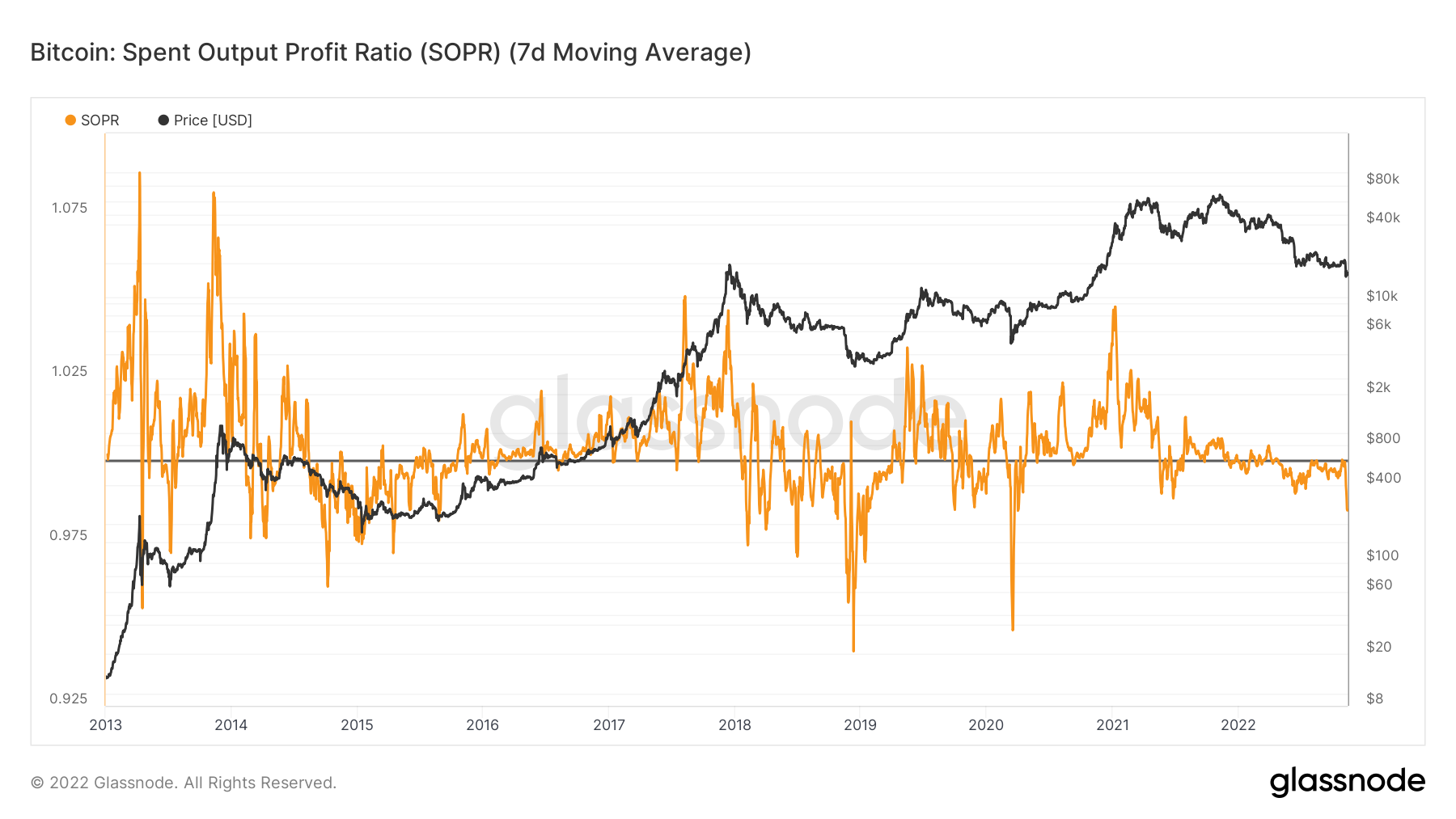 Výše uvedený graf ukazuje jednu z klíčových fundamentálních metrik on-chainu Bitcoinu, takzvaný SOPR, který dělí realizovanou hodnotu BTC (prodejní cena) jejich hodnotou v době nákupu (nákupní cena), tedy cena prodaná / cena zaplacená. Držitelé BTC se pokoušejí vybírat prostředky z kryptoměnových burz do soukromých peněženek a ti, kteří tak nyní činí, často souhlasí s realizací mnohaletých ztrát. SOPR osciluje kolem 1 a obvykle se pod touto úrovní pohybuje v době býčího trhu bitcoinu a nad ní v době býčího trhu, kdy investoři dosahují větších výnosů z investovaného kapitálu. Nerealizované ztráty se během býčího trhu zvyšují a konec medvědího trhu je obvykle spojen s jalově nízkou hodnotou SOPR. Dne 14. listopadu činil sedmidenní klouzavý průměr indexu SOPR 0,9847, což je nejnižší hodnota od krachu souvisejícího s COVID-19 v březnu 2020, kdy cena bitcoinu klesla pod 4 000 USD. Zdroj: SOPR: Stojí za zmínku: Glassnode