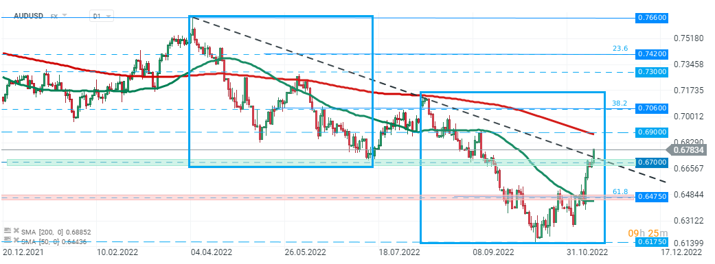Páru AUDUSD se podařilo prorazit nad hlavní rezistenci na úrovni 0,6700, která je vyznačena předchozími cenovými reakcemi a klesající trendovou linií. Další rezistence, kterou je třeba sledovat, se nachází na úrovni 0,6900. Zdroj: xStation5