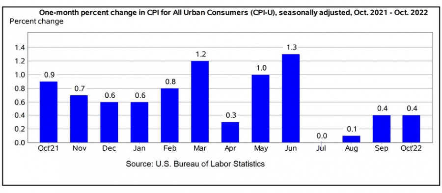 Následující přehled zobrazuje vývoj indexu spotřebitelských cen po měsících od října 2021 do října 2022, který zveřejnil americký Úřad pro statistiku práce. Zpráva o CPI z minulého týdne ukázala, že inflace v říjnu meziročně mírně klesla ze zářijových 8,2 % na 7,7 %. Dlouhodobě je zvýšená, když uvážíme, že před rokem (říjen 2021) byla celková inflace nad 6 % a teď v roce 2022 index spotřebitelských cen neklesá, ale je naopak vyšší než o loňském Halloweenu. Veřejnost si nyní uvědomuje, že se jí dostávalo spíš stále rostoucích životních nákladů.