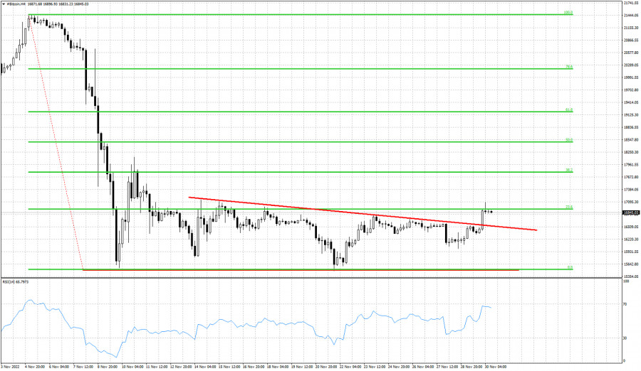 Poté, co se bitcoin dostal na 17 080 USD, obchoduje se kolem 16 840 USD. Jeho cena prorazila nad rezistenci krátkodobé klesající trendové linie, o které jsme se zmínili v předchozí analýze. Bitcoin opět dosáhl hladiny Fibonacciho retracementu 23,6 %. Poslední dva týdny se cena obchoduje uvnitř obchodního rozpětí a nyní atakuje jeho horní hranici. Budou mít býci dost síly, aby nad ni prorazili? Pokud bude hladina retracementu 23,6 % proražena směrem nahoru, očekáváme pohyb bitcoinu k hladině Fibonacciho retracementu 38 % na ceně 17 790 USD. Odmítnutí na ceně 16 930 USD, kde se nachází retracement 23,6 %, by mohlo vyvolat pullback k ceně 16 400 – 16 500 USD. Support se nachází na ceně 16 330 USD a průraz pod něj by byl známkou slabosti.