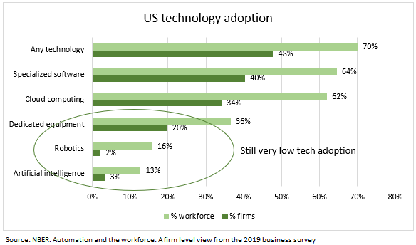 TECH: Studie o zavádění nových technologií v amerických firmách, včetně umělé inteligence, robotiky, specializovaného softwaru a cloud computingu, ukazuje, že jejich využívání je stále relativně nízké. To znamená, že dodavatelé technologií mají před sebou dlouhou růstovou dráhu. Přijímání je silně zatíženo velkými (a mladými) firmami na úkor firem s malou kapitalizací a starších firem. Ukazuje se, že díky tomu mají osvojitelé významný 11% přínos v oblasti produktivity, který bude důležitější s rostoucími náklady na pracovní sílu a riziky recese. Mezi překážkami přijetí technologií vede vnímaná nedostatečná použitelnost, následovaná náklady.
