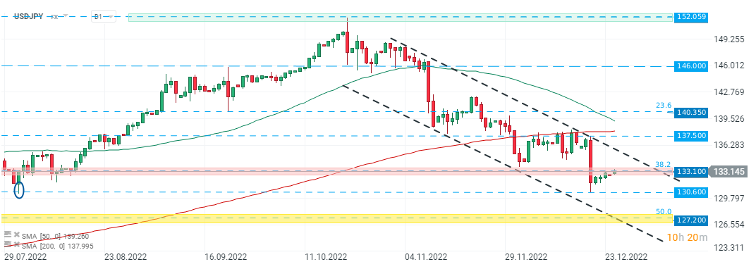 Z technického hľadiska momentálne pár USDJPY testuje silnú rezistenciu na hodnote 133,10, ktorá je označená predchádzajúcimi cenovými reakciami a 38,25 Fibonacciho retracementom pohybu nahor, ktorý sa začal v januári 2021. Ak by došlo k prelomu vyššie, pohyb nahor sa môže zrýchliť smerom k hornej hranici zostupného kanála. Na druhej strane, ak sa predajcom podarí opäť získať kontrolu, nemožno vylúčiť opätovné otestovanie podpory na úrovni 130,60.