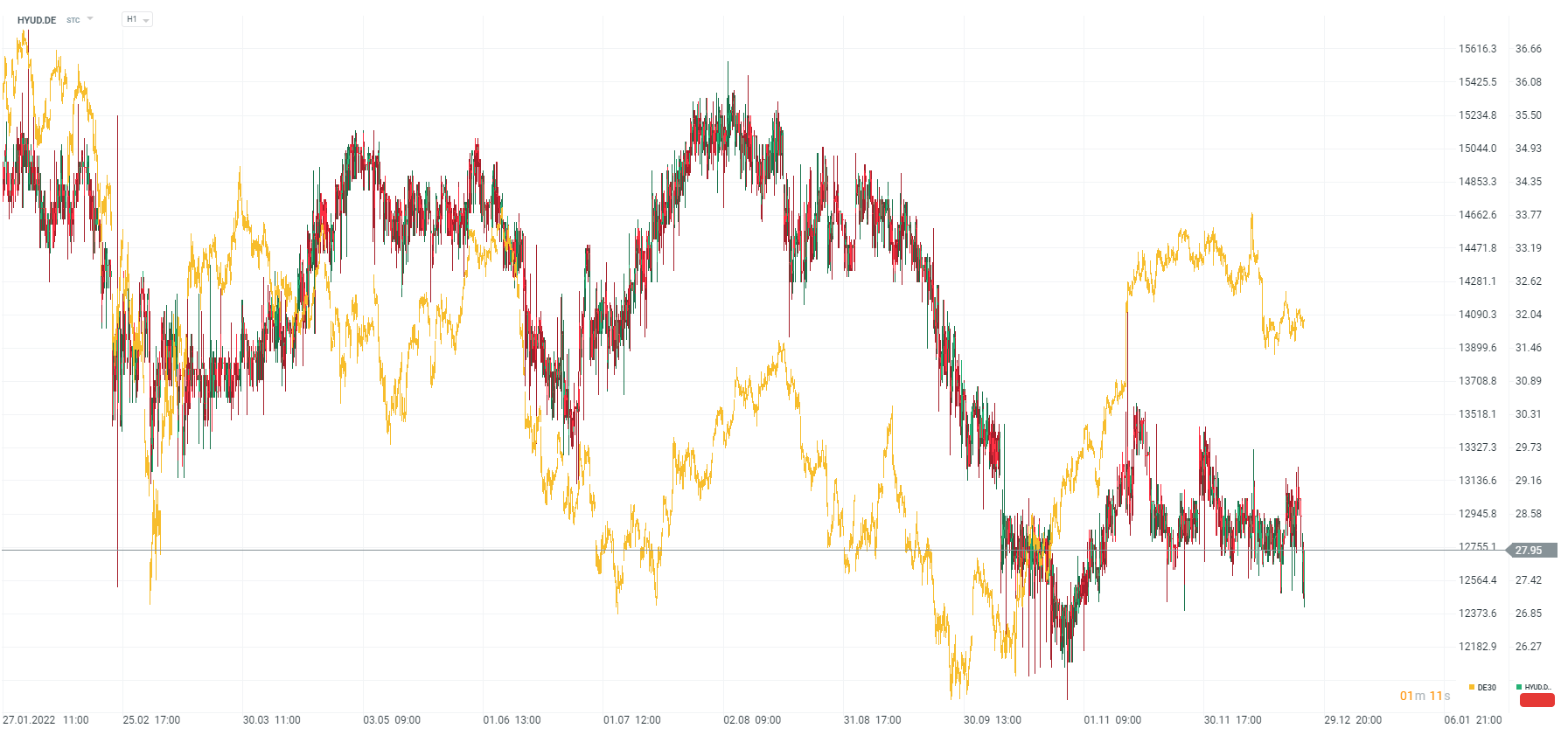 Graf akcií Hyundai (HYU.DE) versus futures DE30 (žlutá čára). Zdroj: xStation5