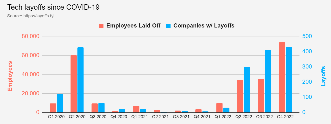 Podle zpráv agentury Reuters zaměstnanci propuštění z technologických gigantů hromadně zakládají nové startupy, především v oblasti umělé inteligence a her. Přestože financování rizikového kapitálu v roce 2022 meziročně pokleslo o 33 % v důsledku změny měnové politiky a vyšších nákladů na financování, počet nových fondů rizikového kapitálu, určených pro startupy, je stále rekordní a neklesl pod úroveň roku 2021. Někteří oboroví analytici již začali spekulovat o možné migraci propuštěných technologických pracovníků do blockchainového sektoru a podnícení tzv. revoluce webu 3.0. zdroj: layoffs.fyi