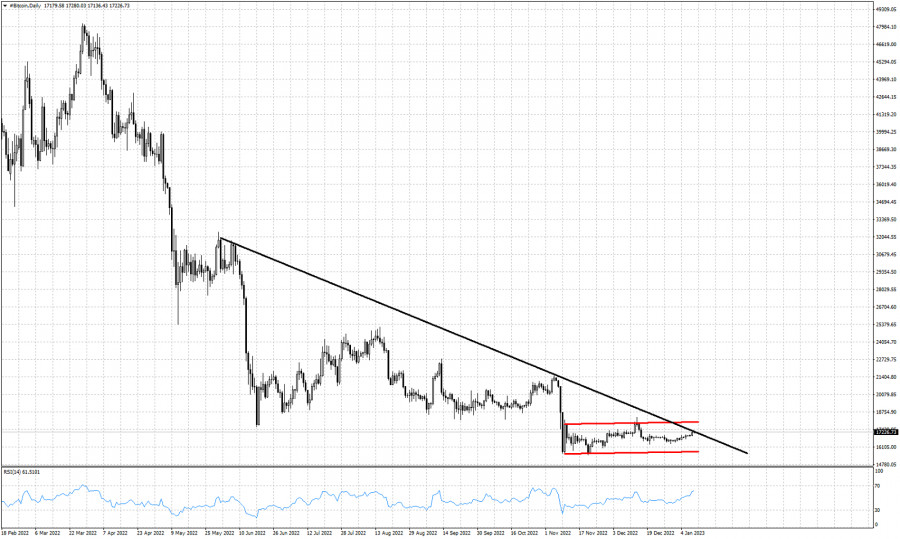 Bitcoin se obchoduje kolem úrovně 17 200 až 17 400 USD. Včera se jeho cena dotkla rezistence klesající trendové linie a byla odmítnuta. Uzavřela níž. Jedná se o významnou zónu rezistence. Průraz nad úroveň 17 400 USD by byl známkou síly. Bitcoin se od listopadového výprodeje po skandálu kolem FTX stále obchoduje do strany. Horní hranice pásma je na úrovni 17 900 – 18 000 USD, a pokud býci prorazí nad 17 400 USD, měli bychom se na tuto úroveň dostat. Support je na úrovni 16 900 USD a průraz pod ni posune cenu k úrovni 15 800 USD.