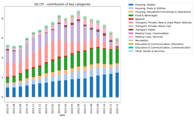 Meziroční míra inflace v USA v prosinci 2022 zpomalila již šestý měsíc v řadě na 6,5 %, což je nejnižší hodnota od října 2021, v souladu s tržními prognózami. Následovala tak po listopadové hodnotě 7,1 %. Náklady na energie vzrostly o 7,3 %, což je výrazně méně než listopadových 13,1 %, neboť náklady na benzin klesly o 1,5 % po listopadovém nárůstu o 10,1 %. Zpomalily také náklady na topný olej (41,5 % oproti 65,7 %), zatímco ceny elektřiny rostly o něco rychleji (14,3 % oproti 13,7 %). Zpomalení bylo zaznamenáno také u cen potravin (10,4 % vs. 10,6 %), zatímco náklady na ojeté osobní a nákladní automobily nadále klesaly (-8,8 % vs. 3,3 %). Naopak rychleji rostly náklady na přístřeší (7,5 % vs. 7,1 %). Ve srovnání s předchozím měsícem se index spotřebitelských cen snížil o 0,1 %, což byl první pokles od května 2020, a překonal prognózy, které předpokládaly, že se hodnota nezmění.