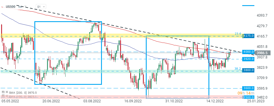 US500 se po zveřejnění údajů o CPI odrazil od klíčové rezistence na úrovni 4000 bodů. Nejbližší sledovaná podpora leží na úrovni 3900 bodů. Zdroj: xStation5