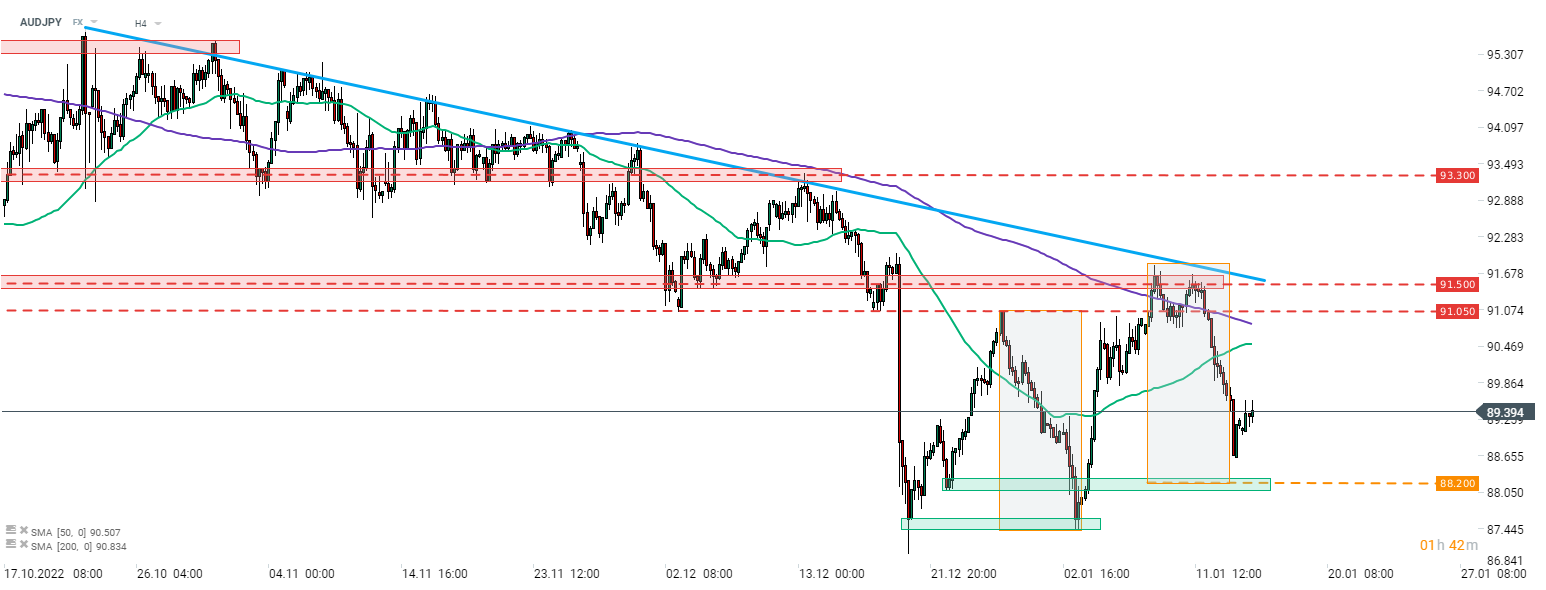 Keď sa pozrieme na graf AUDJPY v intervale H4, môžeme vidieť, že nedávne oživenie páru bolo zastavené mierne pod strednodobou klesajúcou trendovou čiarou. Pár neskôr pokračoval v poklese a tento pokles bol zastavený pred dosiahnutím spodnej hranice lokálnej geometrie trhu, čo signalizuje, že krátkodobý vzostupný trend, ktorý bol spustený koncom decembra 2022, je stále v hre.