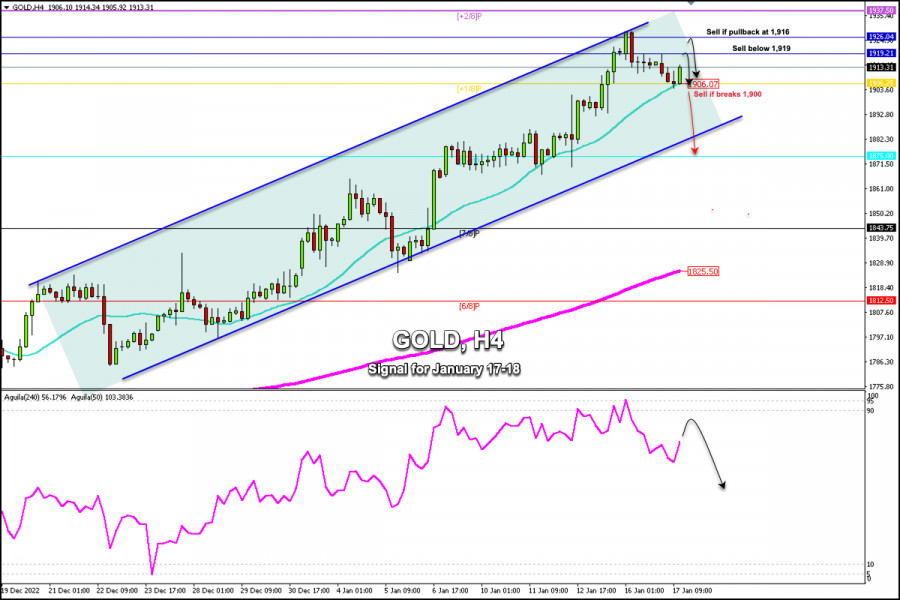 Obchodní signál pro ZLATO (XAU/USD) na 18.–19. ledna 2023: prodávejte pod úrovní 1 910 ( Murray +1/8 – 21 SMA)