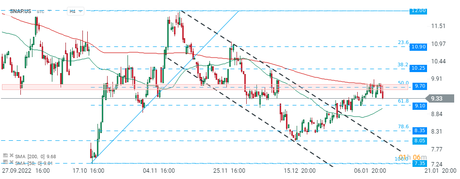 Akcie Snap (SNAP.US) se obchodují téměř 89 % pod svým historickým maximem ze září 2021 na úrovni 83,30 USD. Kupující se v polovině prosince 2022 aktivizovali a zahájili vzestupnou korekci, nicméně býčí momentum ztratilo páru kolem hlavní rezistence na úrovni 9,70 USD, která se shoduje s 50,0% Fibonacciho retracementem poslední vzestupné vlny a 200 SMA (červená linie). Dokud se cena bude nacházet pod touto úrovní, může dojít k dalšímu impulsu směrem dolů k minimům z října 2022 na úrovni 7,35 USD. Na druhou stranu, pokud se kupujícím podaří překonat výše zmíněnou zónu odporu, pak se další klíčová rezistence, kterou je třeba sledovat, nachází kolem maxim z listopadu 2022 na úrovni 12,00 USD. Zdroj: xStation5
