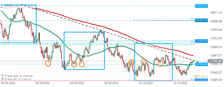 US100 pokračuje v růstu a testuje dlouhodobou klesající trendovou linii, protože investoři očekávají méně jestřábí FED. Zdroj: xStation5