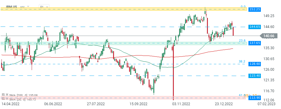 Akcie IBM (IBM.US) se v posledních dnech stáhly ze svých maxim z roku 2022 poté, co v posledních 52 týdnech zaznamenaly kladné výnosy. Akcie dnešní seanci zahájily medvědí cenovou mezerou a směřují k lokální podpoře na úrovni 137,65 USD, která je vyznačena předchozími cenovými reakcemi a 23,6% Fibonacciho retracementem vzestupné vlny zahájené v březnu 2020. Zdroj: xStation5