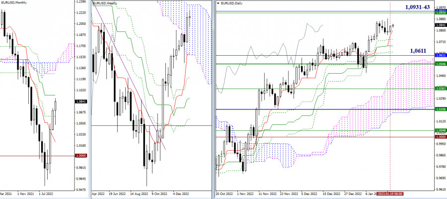 Obchodní týden pomalu končí, ale žádná strana páru EUR/USD se neprosadila. Měnový pár se konsoliduje s nejistými vyhlídkami. Nejbližším cílem růstu zůstává zóna konvergence mezi horní hranicí týdenního cloudu (1,0931) a měsíční střednědobou trendovou linií (1,0943). Support stále představují úrovně denního kříže Ichimoku jako 1,0799 – 1,0733 – 1,0685 – 1,0637, měsíční support na úrovni 1,061 a týdenní support na úrovni 1,0546–55.
