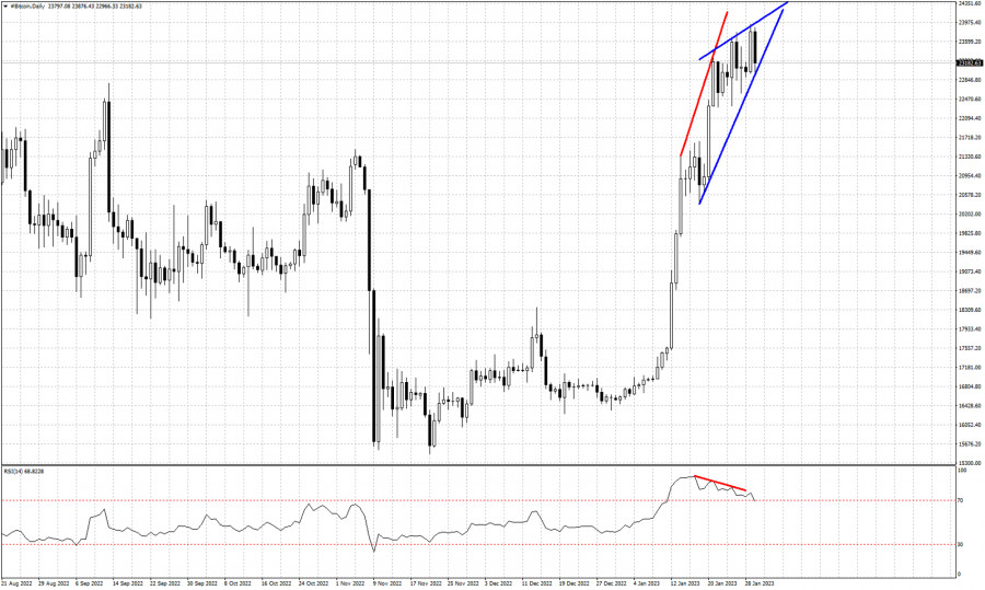Z technického hlediska zůstává bitcoin v býčím trendu a vytváří vyšší maxima a vyšší minima. Cena vytvořila vzor vzestupného klínu a RSI nadále poskytuje signály medvědí divergence. Vzestupný trend slábne a brzy očekáváme obrat. Po včerejším novém maximu následovalo další nižší maximum RSI. Takové chování oscilátoru je známkou medvědího trendu a upozorněním na brzký obrat. Obchodníci musejí být opatrní. Z technického hlediska máme support na ceně 22 500 USD. Průraz pod tuto úroveň by byl známkou obratu.