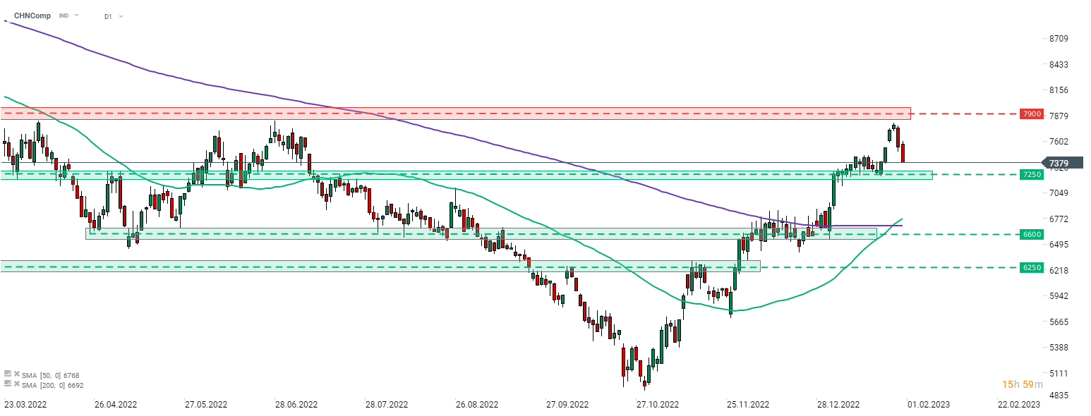 Navzdory mnohem lepším výsledkům čínského PMI, než se očekávalo, se dnes indexy z Asie a Tichomoří obchodovaly níže. CHNComp dnes ztratil 2 % a přiblížil se zóně podpory na 7 250 bodech. Zdroj: xStation5